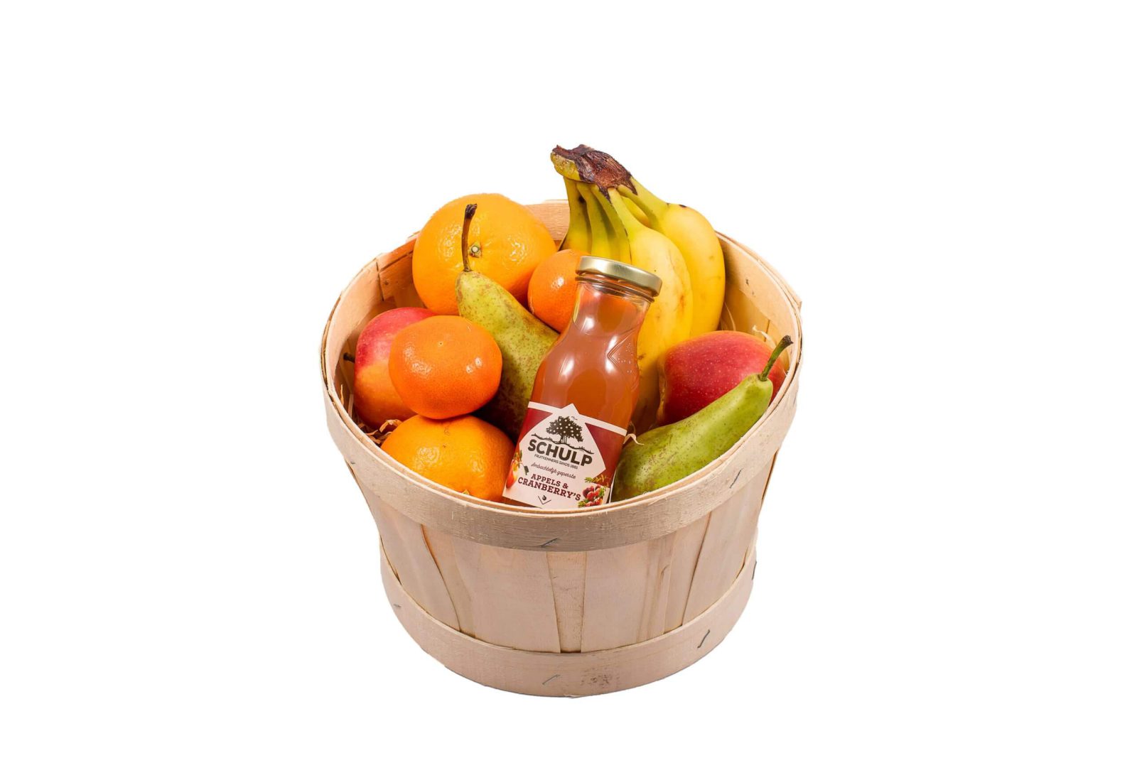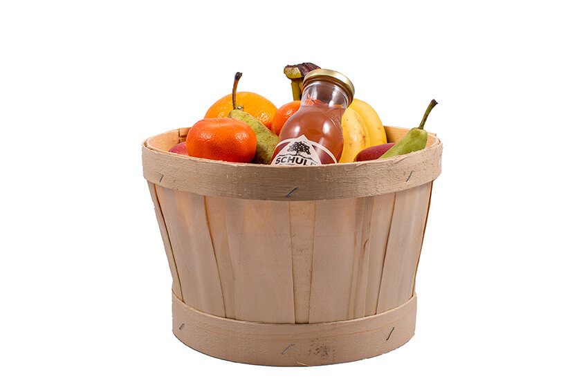 Wil je iemand feliciteren? Deze Fruitmand Basic+ is verpakt in een mooie houten fruitmand gevuld met vers fruit (ca. 13 stuks) en een Schulp vruchtensap (fruitsap zonder toevoegingen).